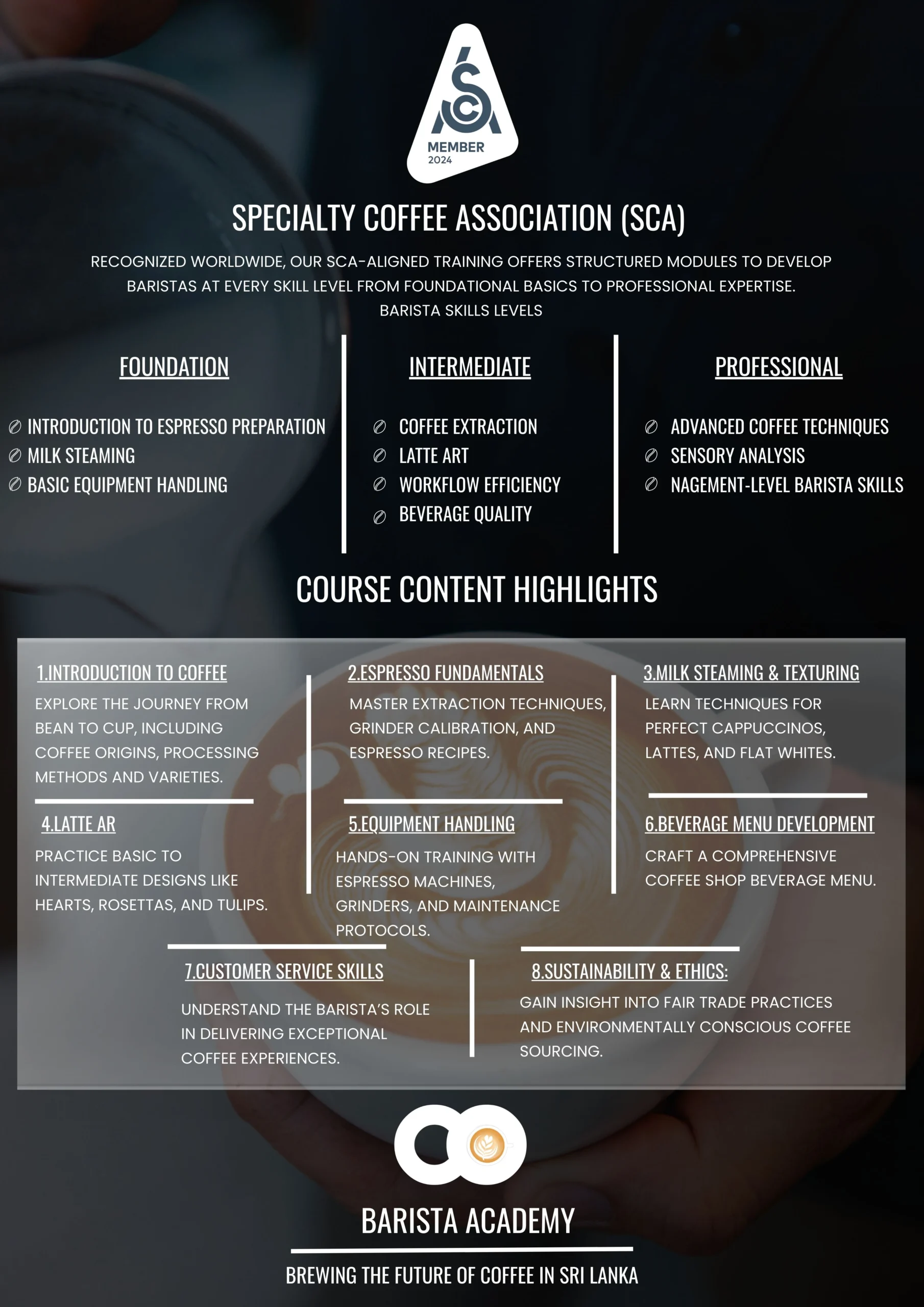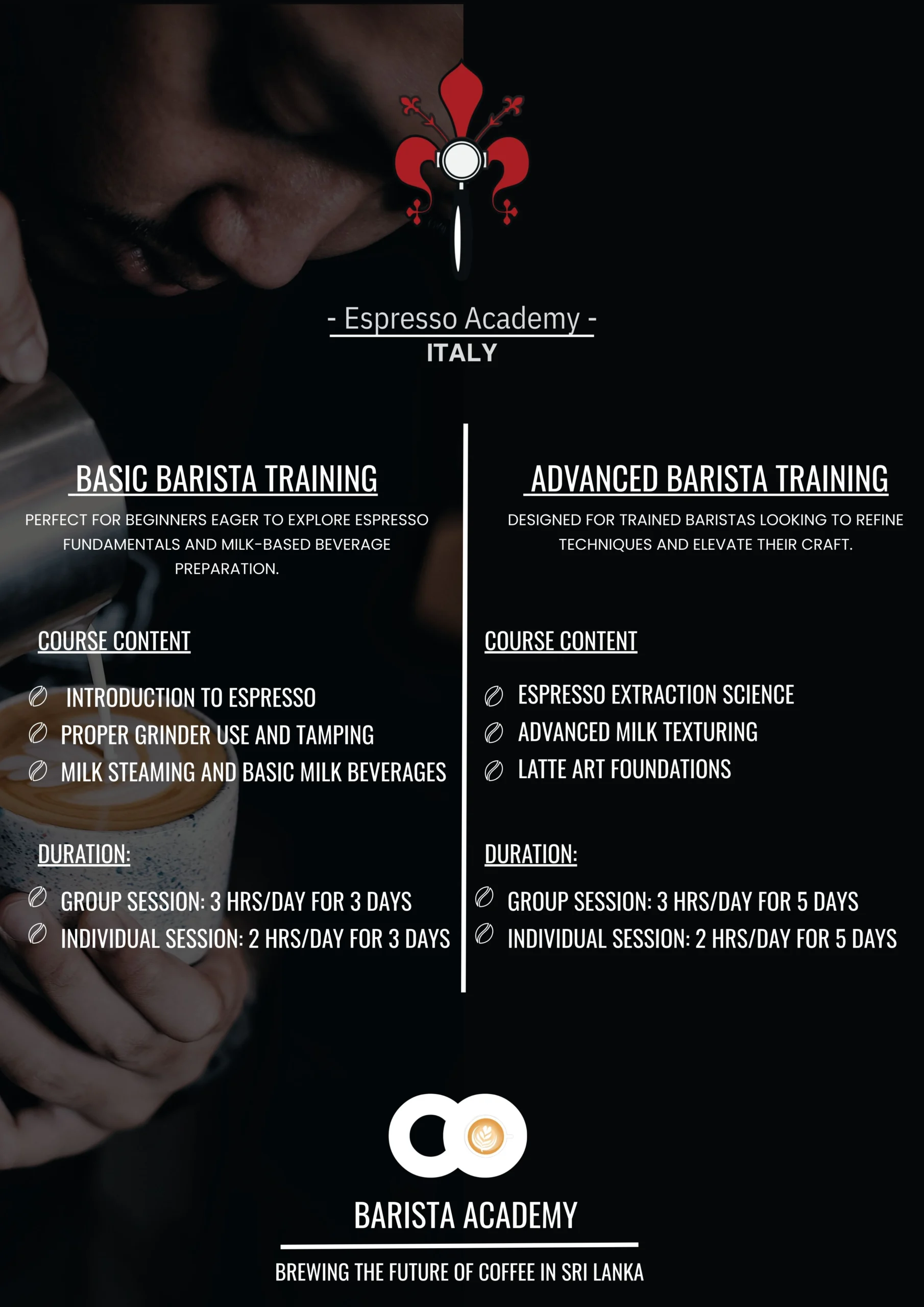 Barista Academy is the training arm of Colombo Coffee Company. We offer internationally recognized coffee education. Our programs meet global training standards and are tailored to inspire both coffee enthusiasts and professionals alike.
